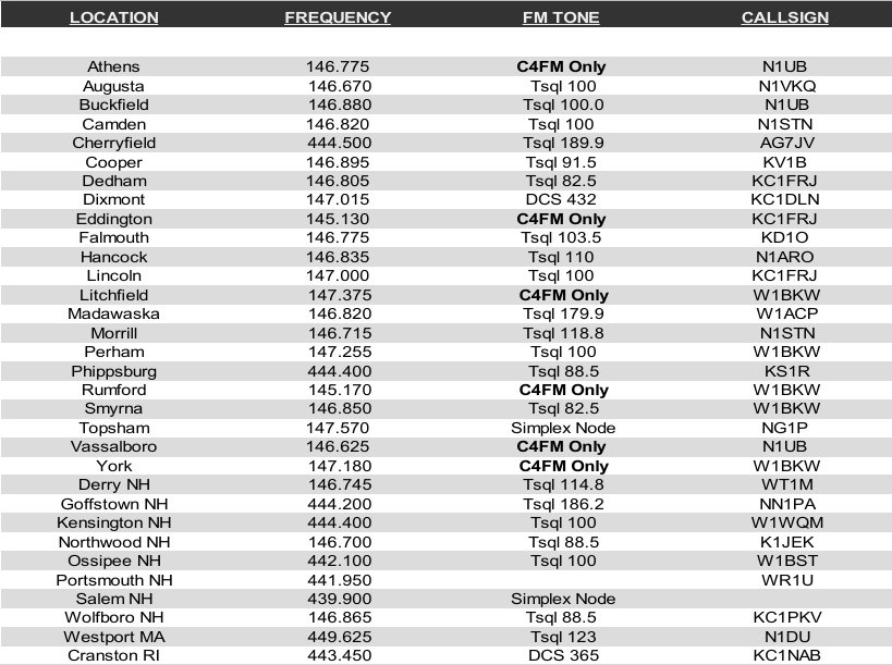 UFB New England repeaters cover the majority of Maine as well as New Hampshire and Northern Massachusetts. All repeaters operate on Yaesu System Fusion and are linked together on the UFB New England room. Most also operate on FM as stand-alone repeaters. The repeaters are connected to Wires-X room 62148, UFB New England, and can also be accessed using XLX reflector XLXUFB.